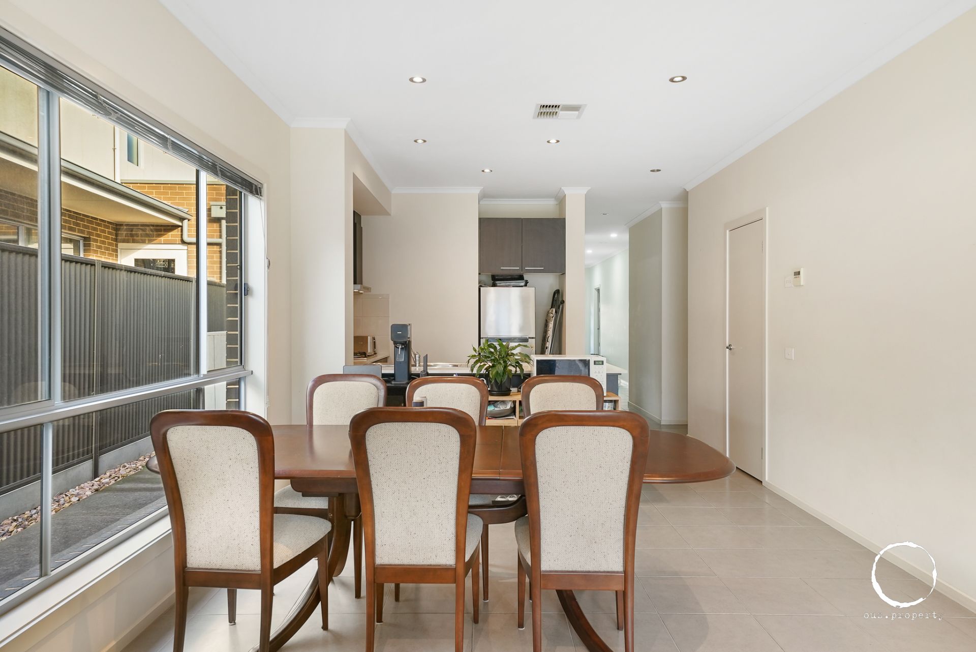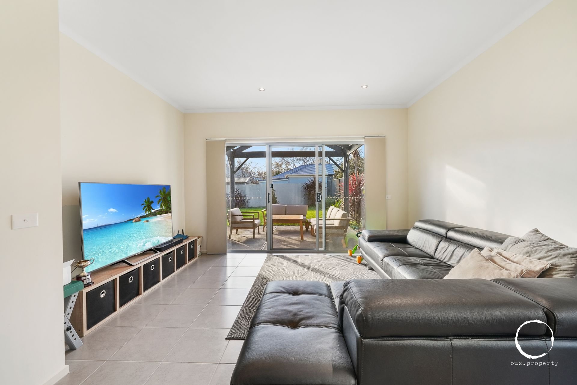 - Open living/dining, tiled throughout