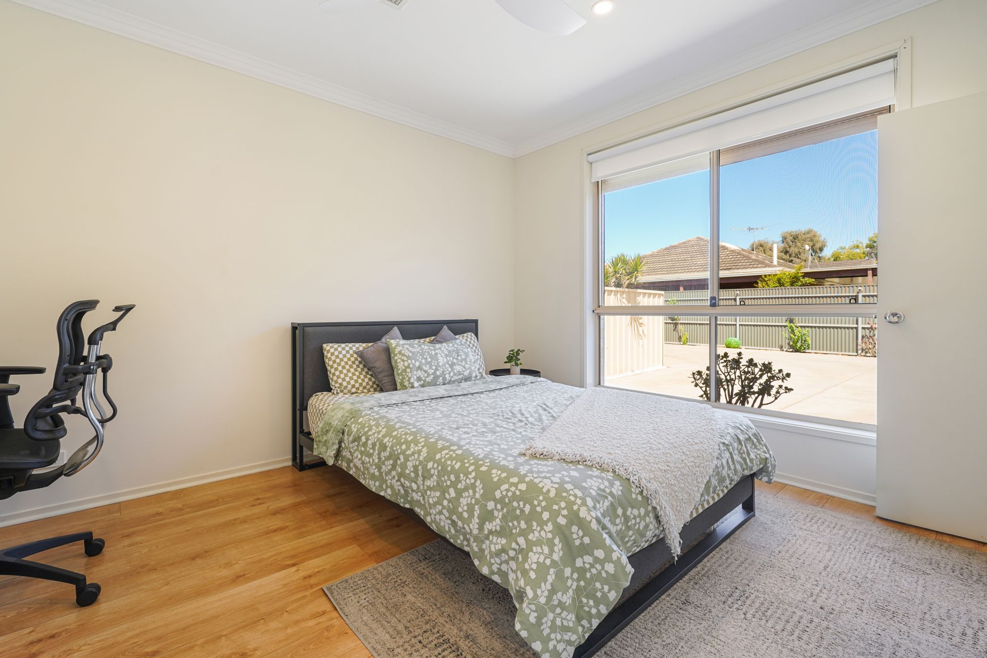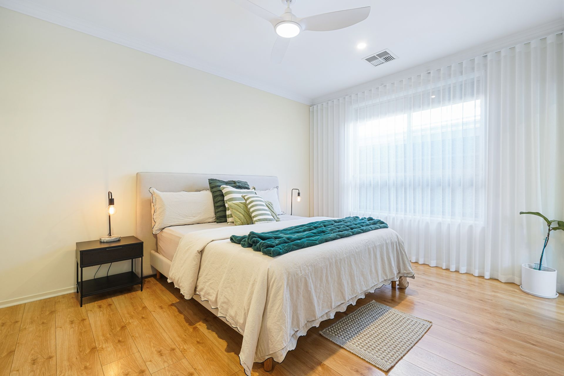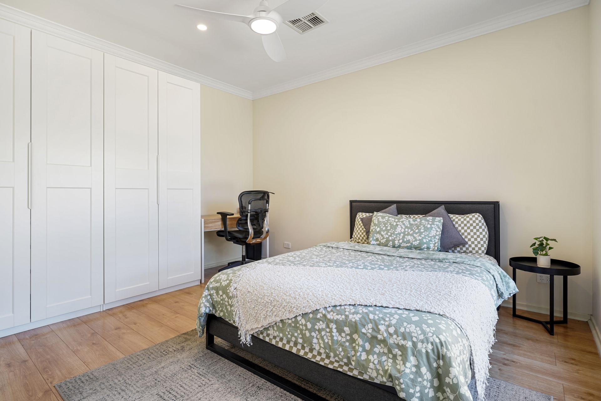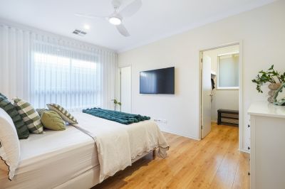 The master suite is elegantly appointed and includes a spacious walk-in robe and a private ensuite featuring a stylish vanity and shower. Two additional generously sized bedrooms offer built-in robes and ceiling fans and are serviced by a beautifully finished central bathroom of exceptional quality.