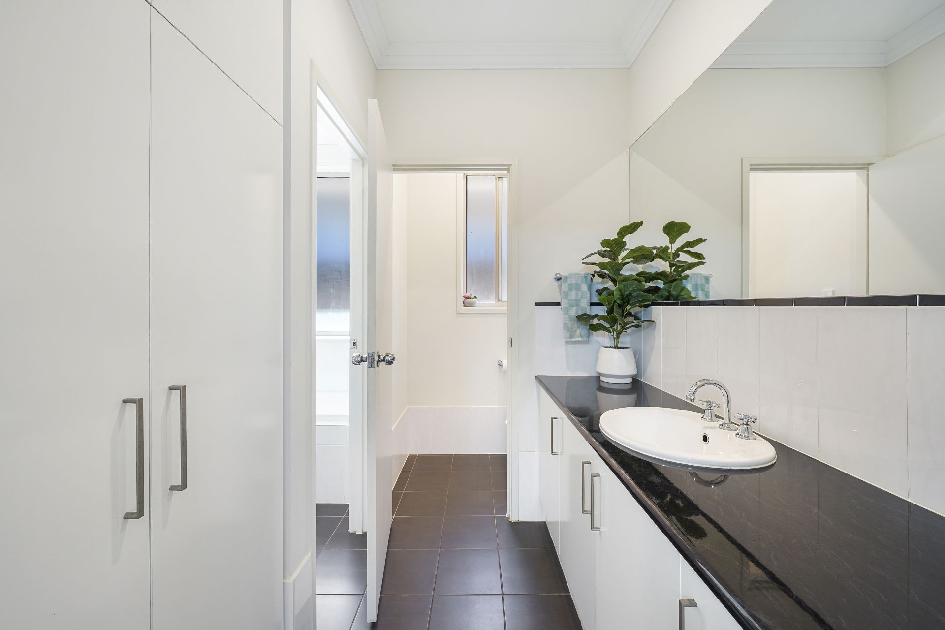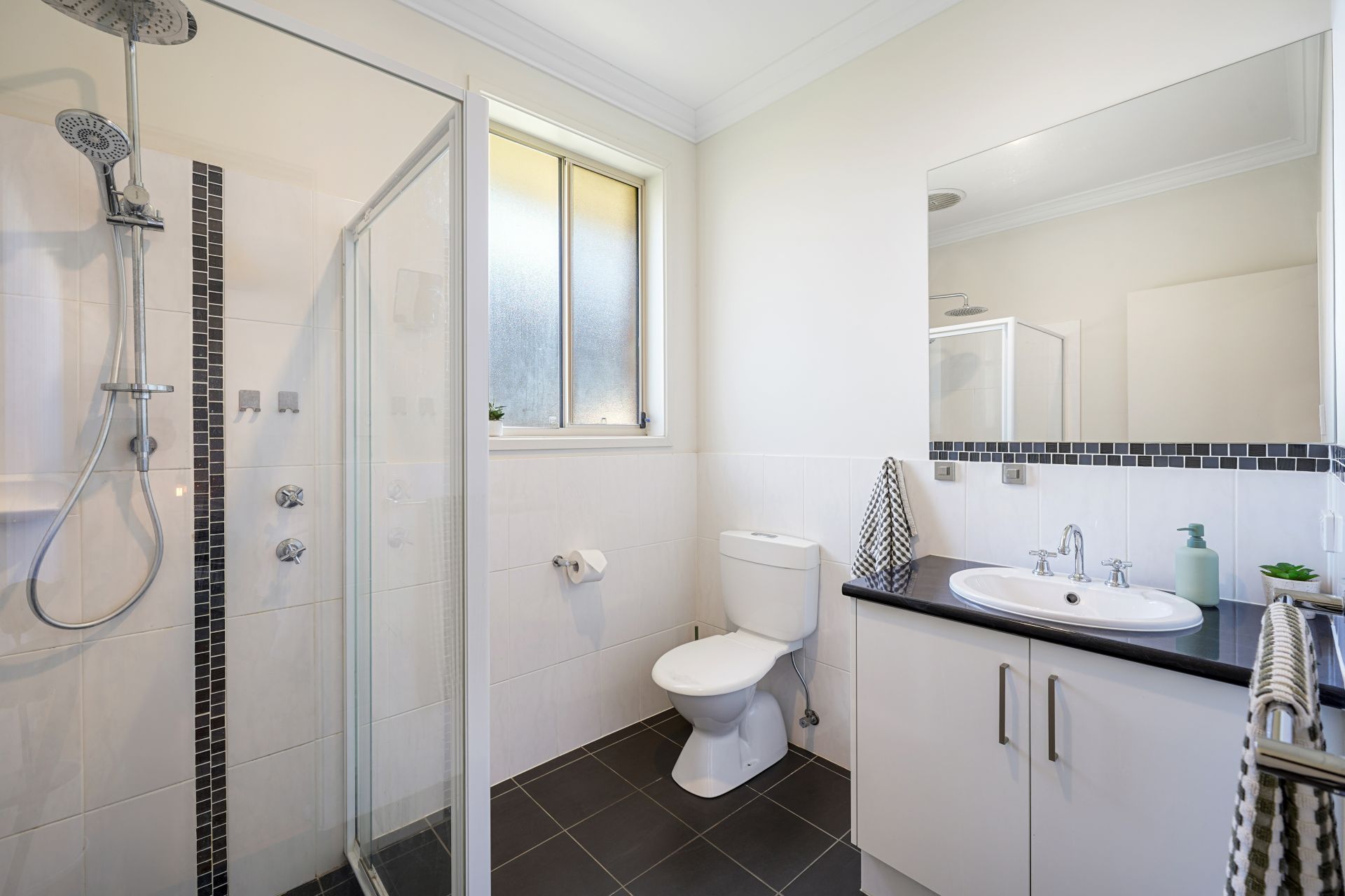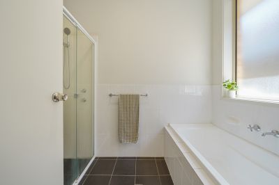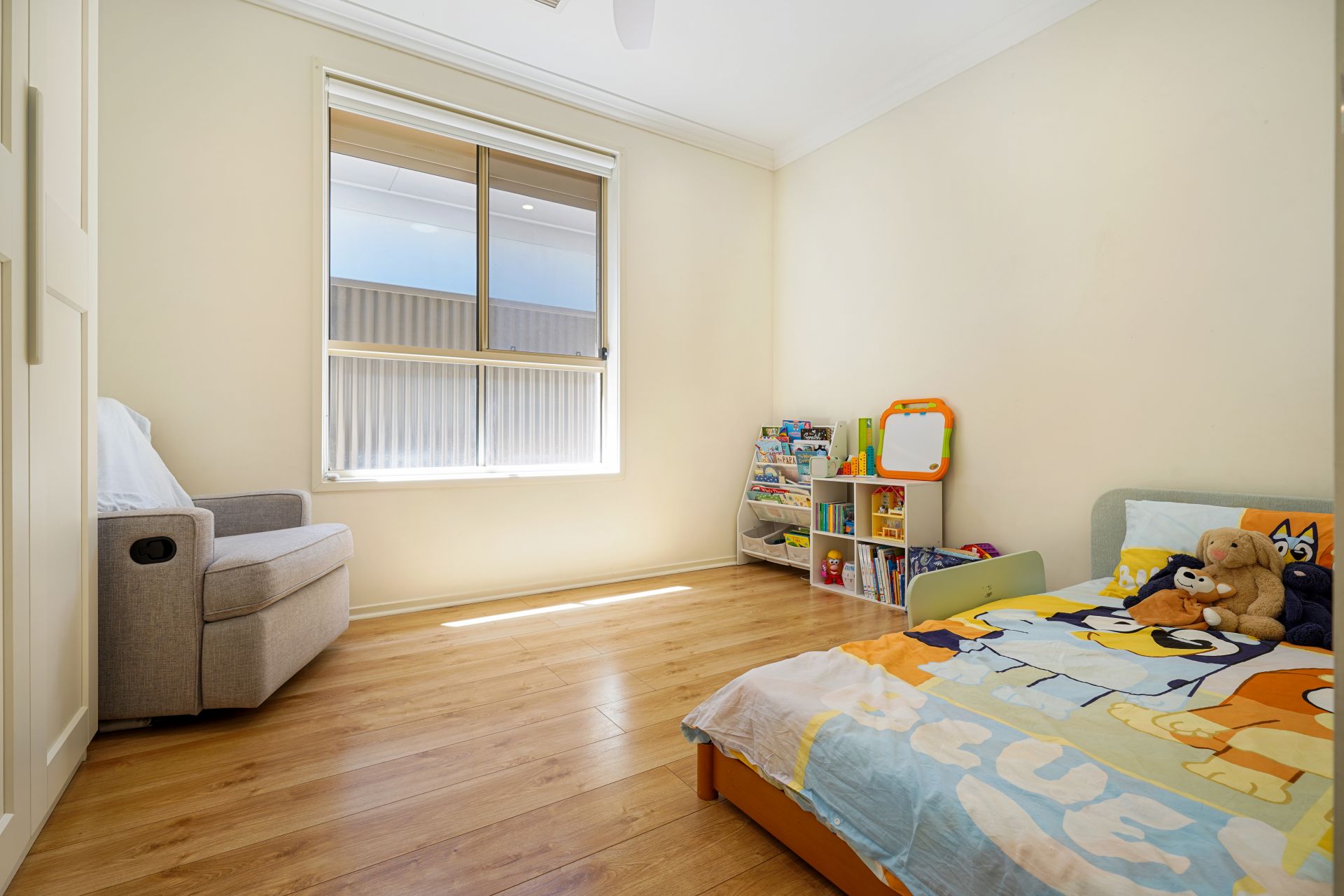 The master suite is elegantly appointed and includes a spacious walk-in robe and a private ensuite featuring a stylish vanity and shower. Two additional generously sized bedrooms offer built-in robes and ceiling fans and are serviced by a beautifully finished central bathroom of exceptional quality.