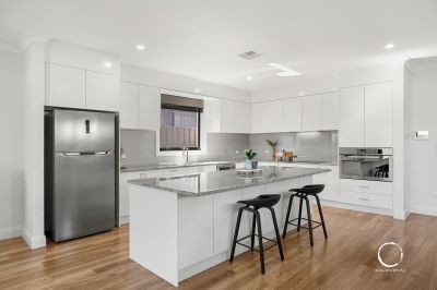 At the heart of the home is the large kitchen which is impressive and most families would appreciate, where family and friends naturally gather. This custom kitchen is complete with stainless steel appliances, including a induction cooktop and 900mm, oven, integrated rangehood, dishwasher, and expansive 20mm granite stone benchtops, this kitchen is both practical and beautiful. Another hidden surprise is the large walk-in pantry and generous storage options make it as functional as it is stylish.