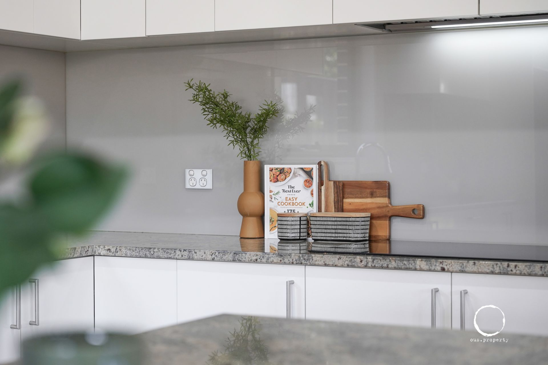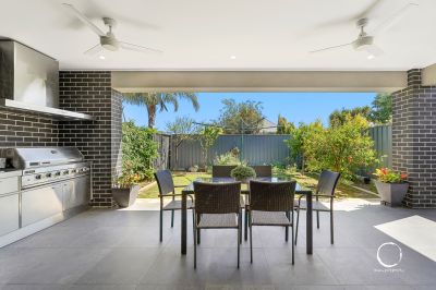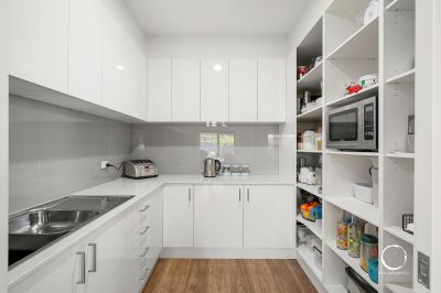 The kitchen seamlessly overlooks the open-plan living and dining area, which flows effortlessly through glass doors to the undercover alfresco with built in BBQ, range hood and kitchen which is perfect for year-round entertaining. Enjoy summer evenings hosting friends or simply relax with a glass of wine while watching the kids play on the manicured lawn or you can tinker around in the vegetable garden.