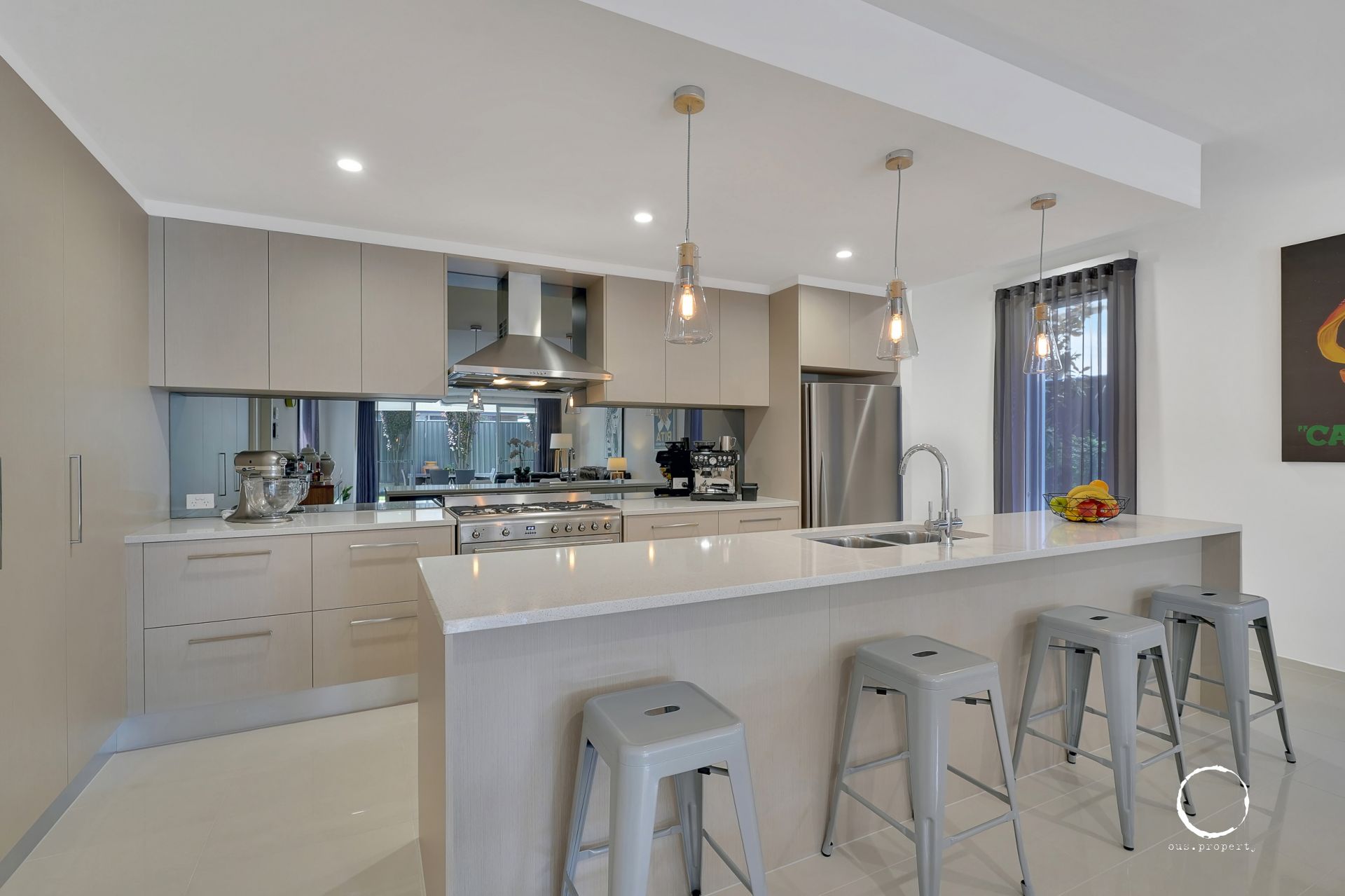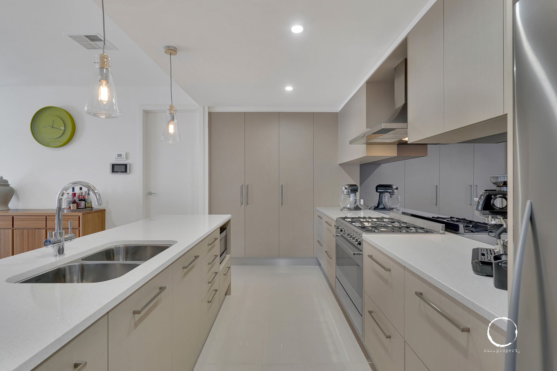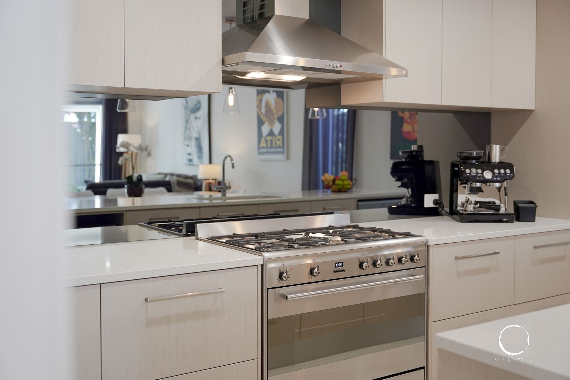- Luxury kitchen with Caesar stone bench tops, Smeg appliances, 900mm gas cooktop