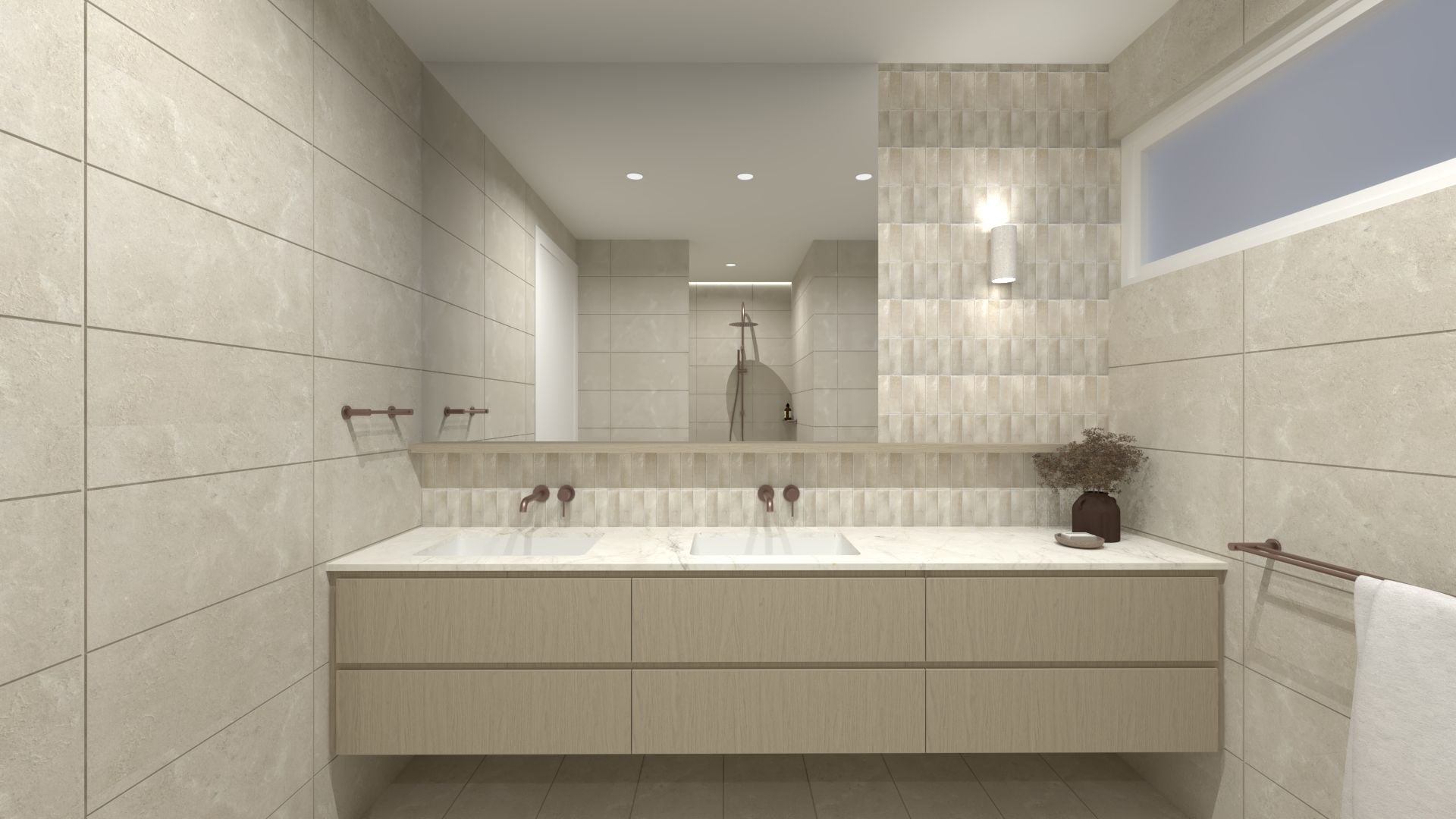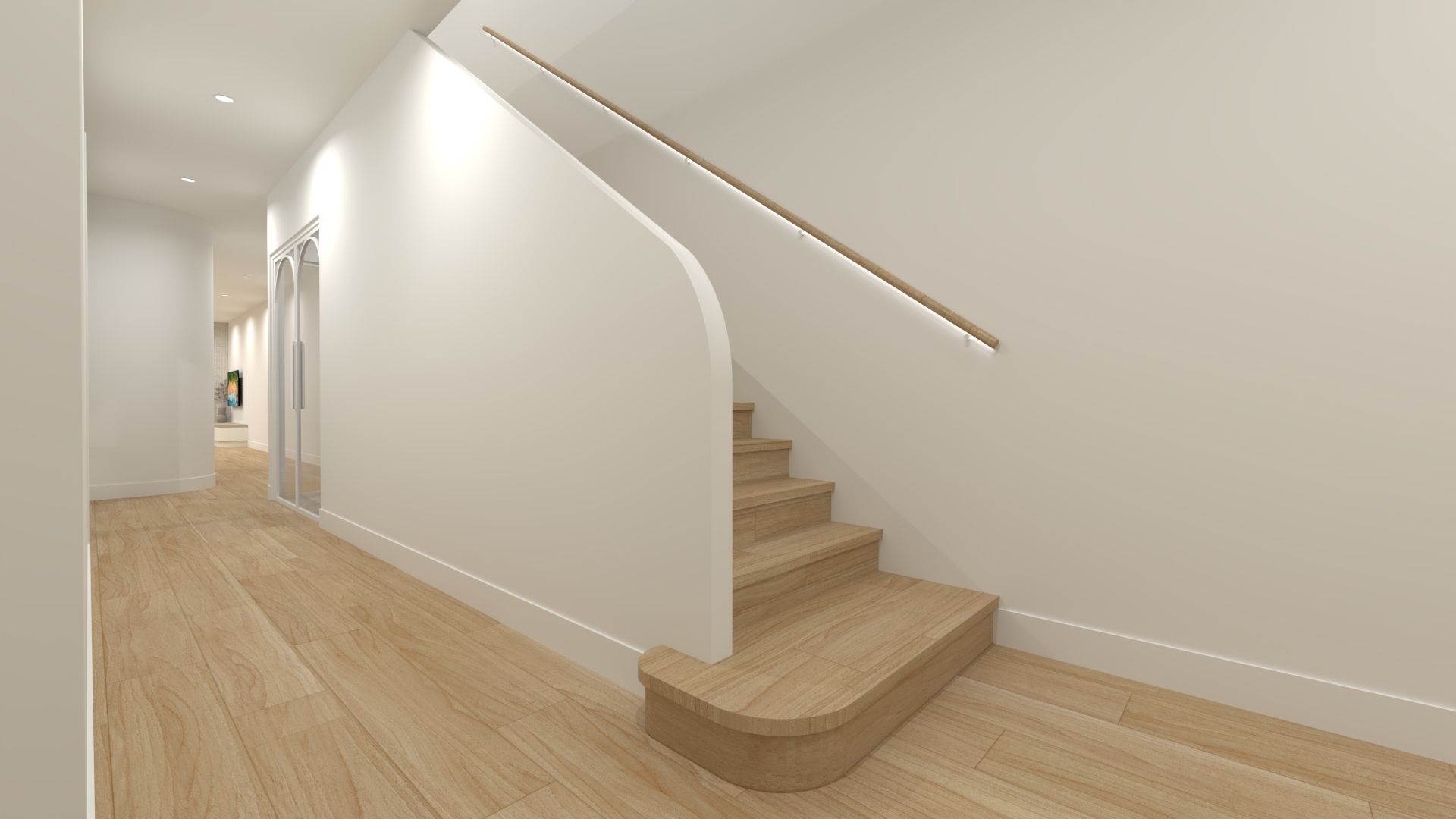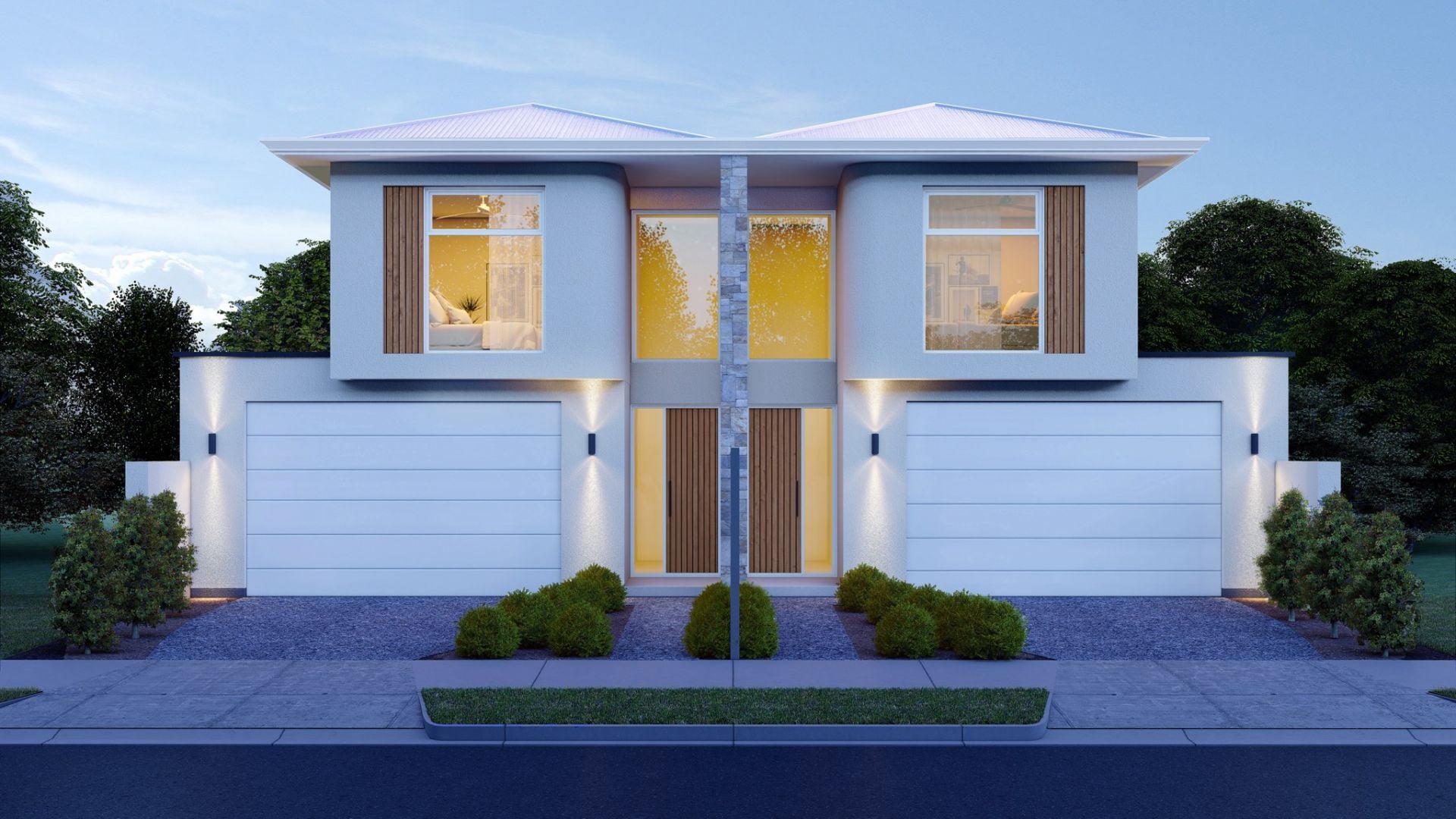 Upstairs, the home offers three spacious bedrooms, including a second master retreat highlighted by a striking curved feature wall and high-end finishes throughout.