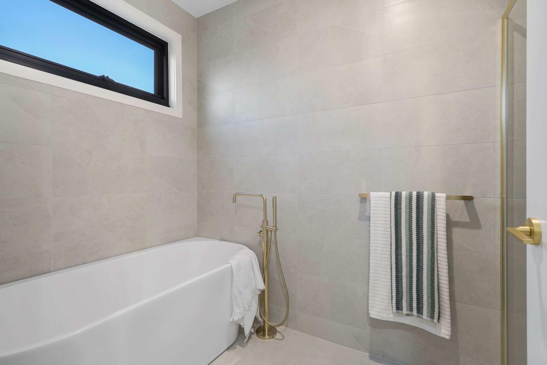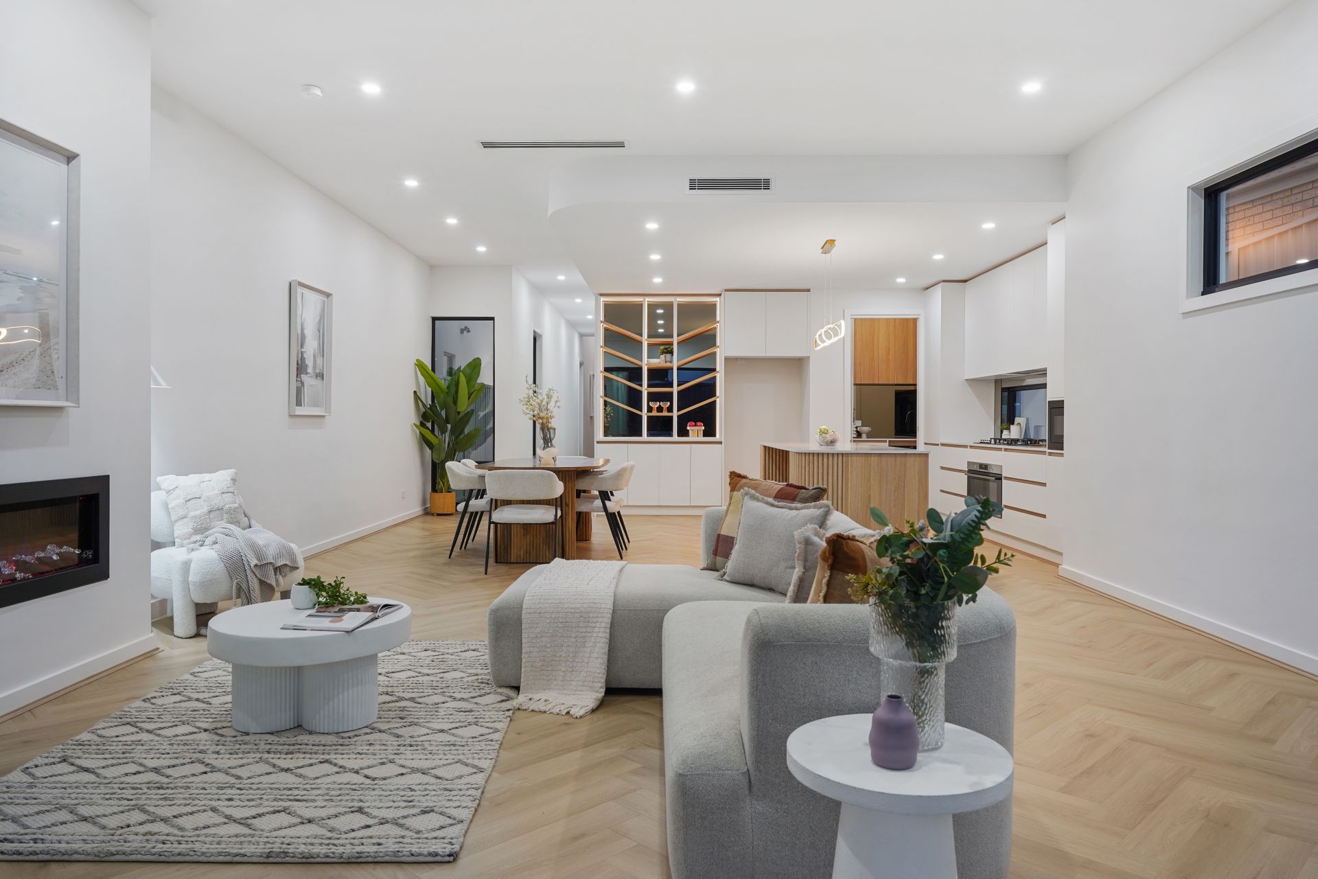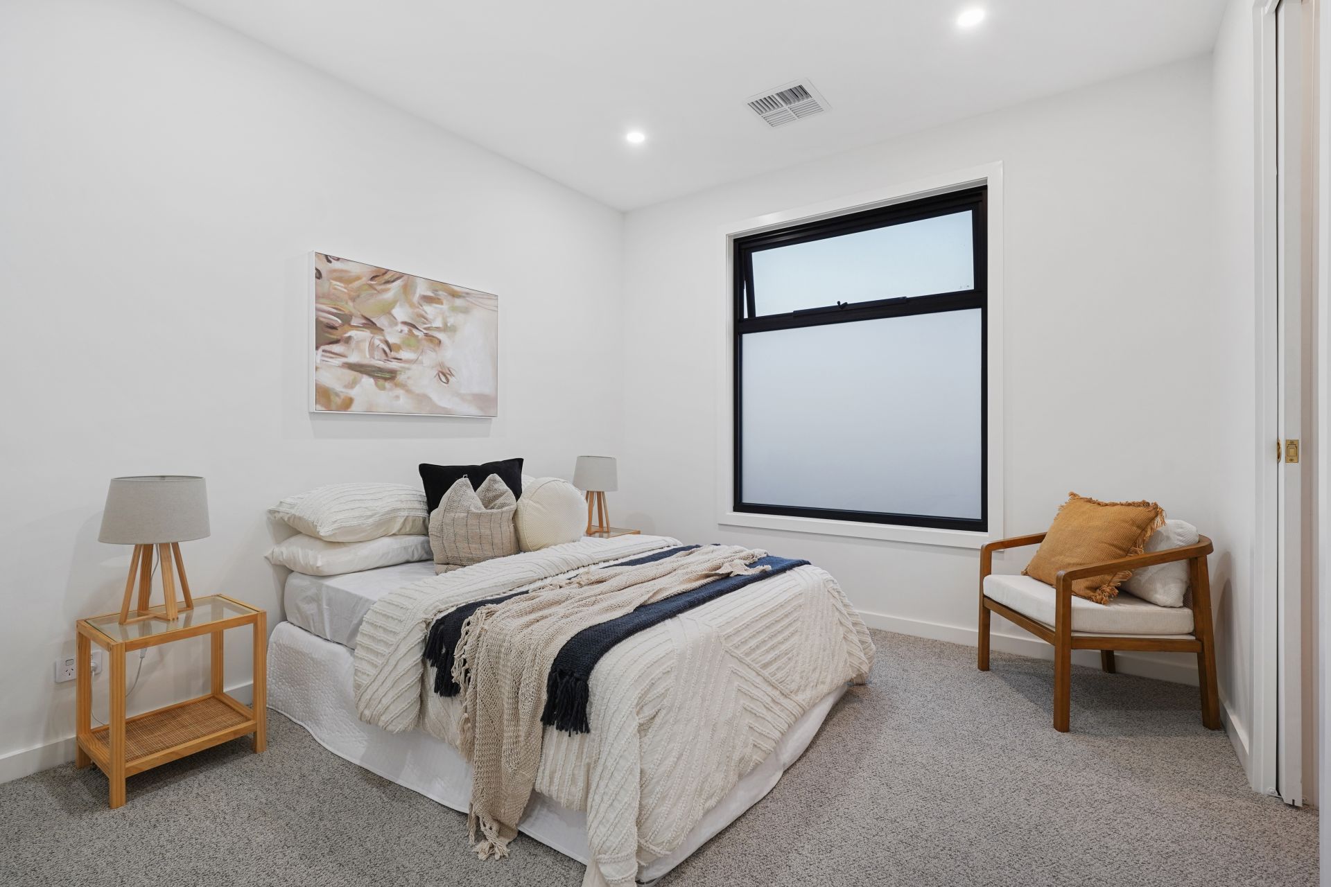 Across the home, three luxuriously appointed bathrooms feature floor-to-ceiling tiling, frameless shower screens, and timeless finishes. Upstairs, two spacious bedrooms with walk-in robes are serviced by a beautifully designed main bathroom complete with a feature bathtub, while a generous second living area with custom cabinetry provides an ideal retreat for children or a relaxed secondary lounge.