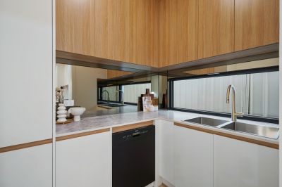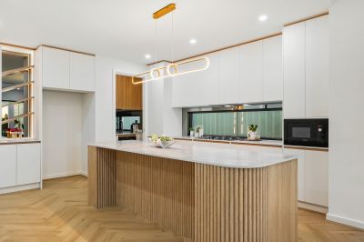 At the heart of the home, the designer kitchen is a true culinary showpiece. Stone benchtops, soft-close cabinetry with warm timber accents, premium appliances, and a generous walk-in pantry combine both beauty and practicality. The sculptural curved island bench forms a striking architectural centrepiece, complemented by high-quality appliances including a Smeg dishwasher, 900mm oven, built-in microwave, and Smeg gas cooktop - perfectly suited for everyday cooking or hosting in style.