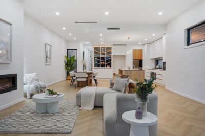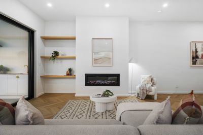 The expansive open-plan living area radiates warmth and sophistication, anchored by a built-in gas fireplace and bespoke joinery. Glass stacker doors create a seamless indoor-outdoor connection, opening to an impressive alfresco entertaining space complete with a BeefEater built-in BBQ and beautifully landscaped gardens. Designed for year-round enjoyment, this outdoor retreat is ideal for lively summer gatherings or intimate winter evenings.