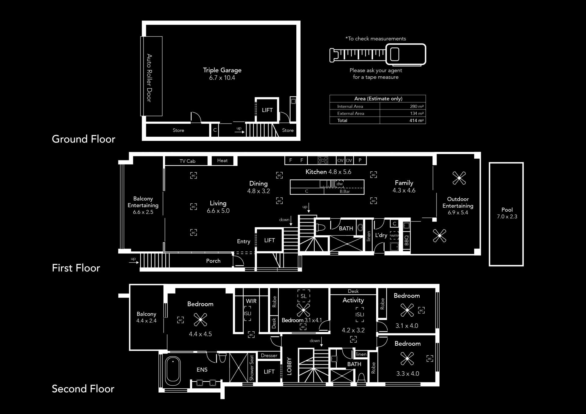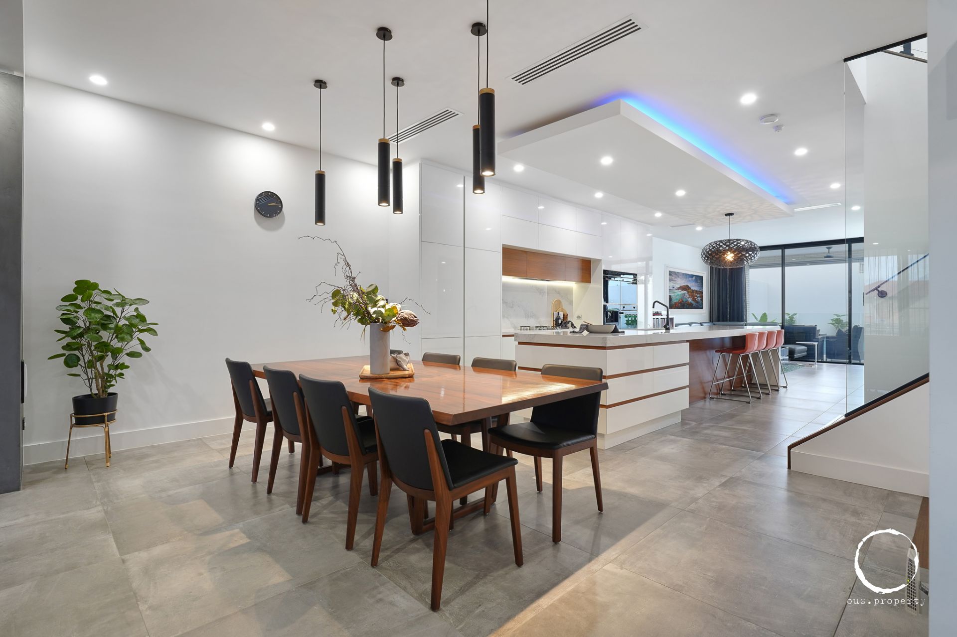 Three generous levels encompass a 414sqm layout showcasing uncompromising space flawlessly finished in fashionable finery. From the showroom-style triple car garage complete with a lift to the top level master suite's romantic terrace, this magnificent residence makes a bold and beautiful statement.