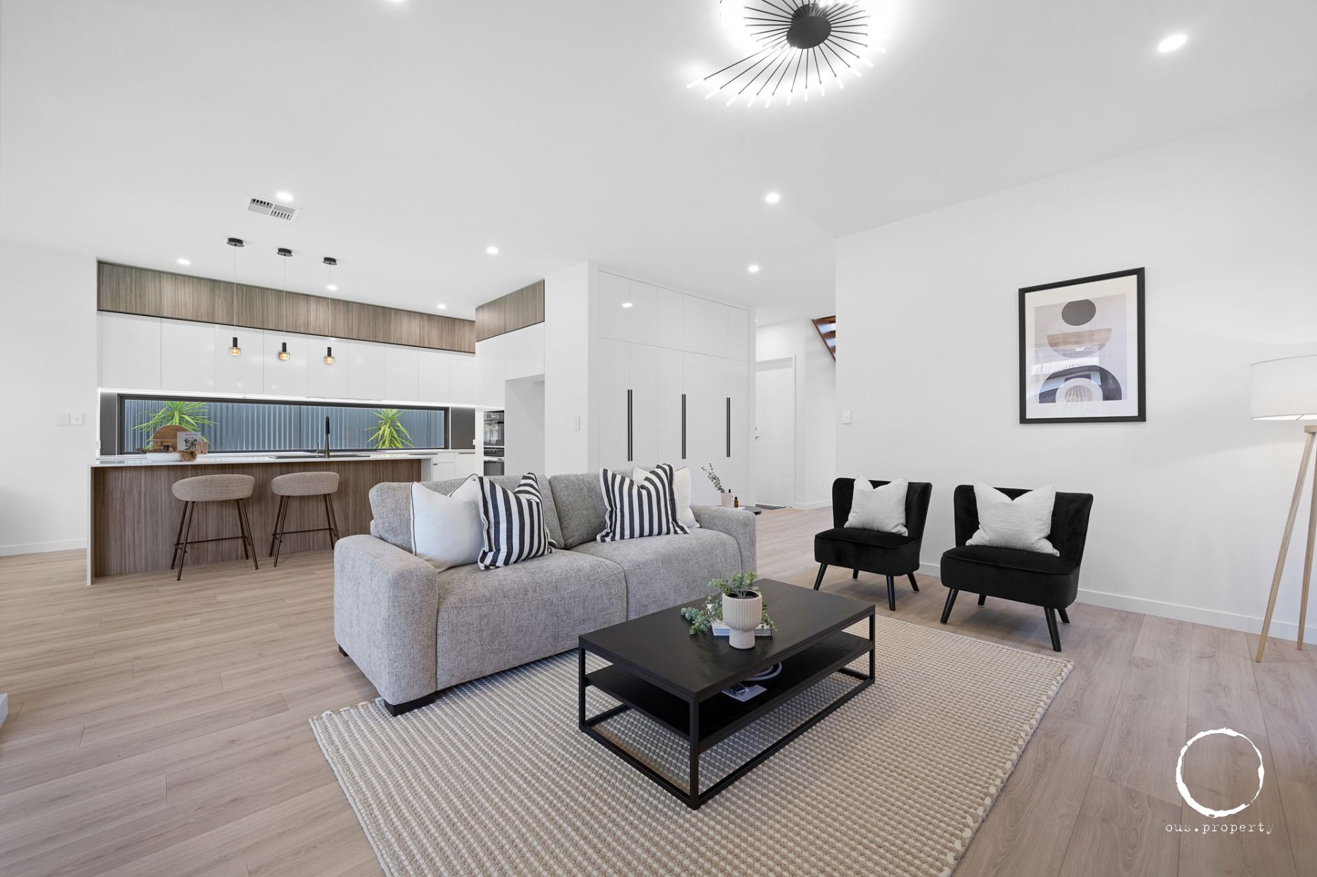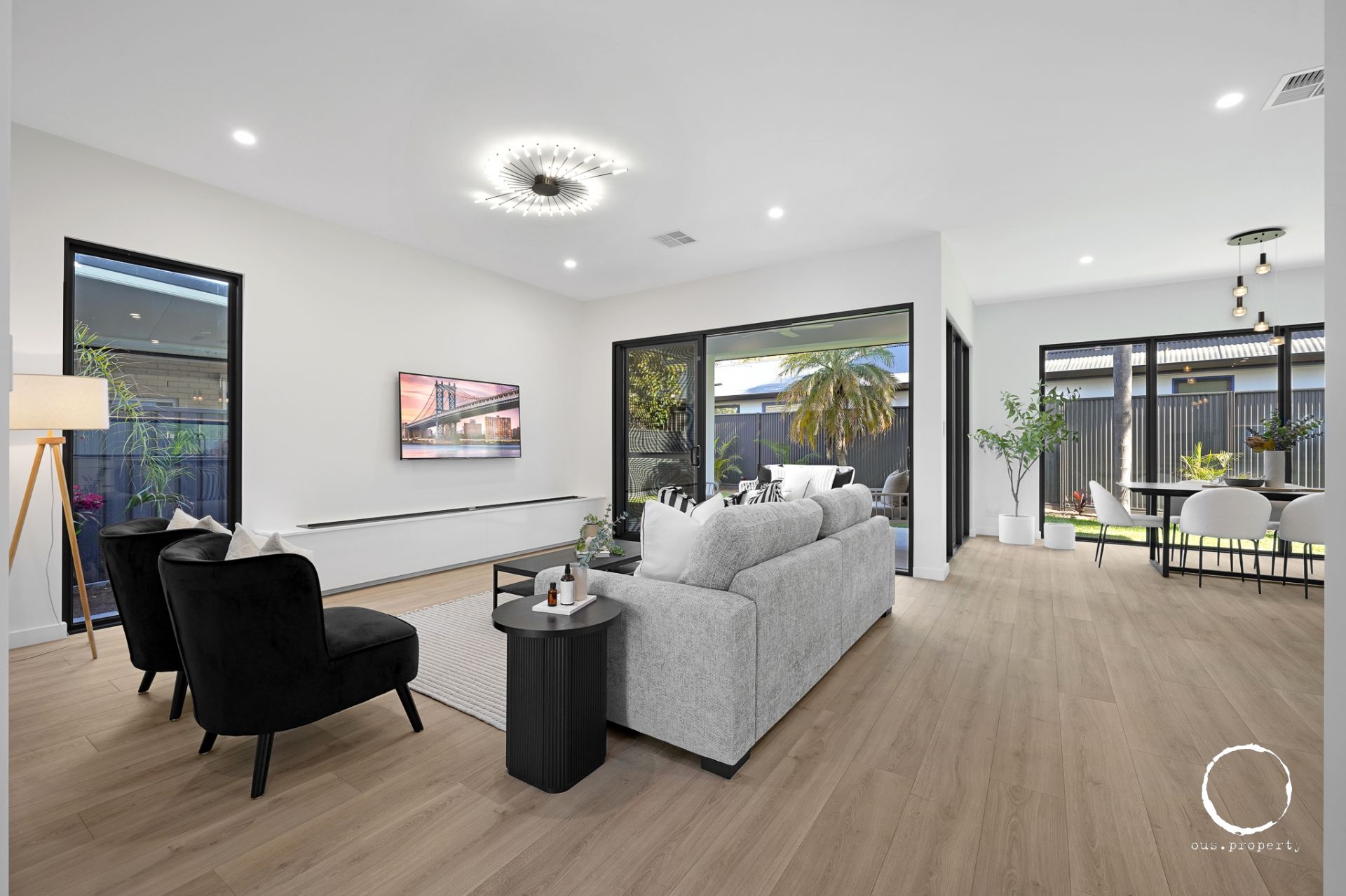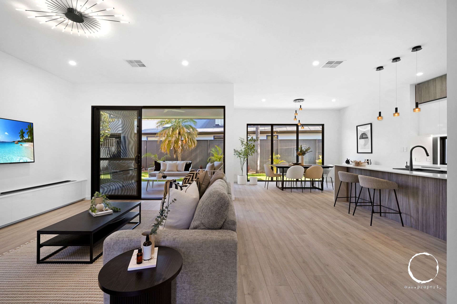 • Open plan living area with floorboards, feature lighting, alfresco connection