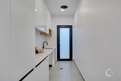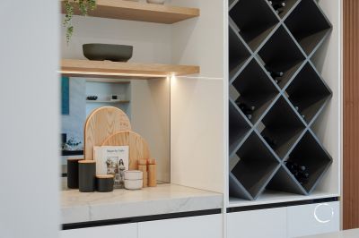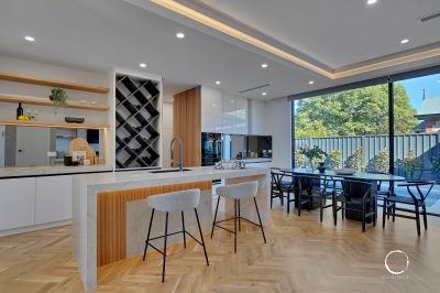 While wow-worthy design flows throughout, the kitchen takes the cake. It boasts a sensational butler's pantry with 40mm stone benchtops, two pyrolytic Miele ovens, an Artusi induction cooktop, integrated fridges, a dishwasher, feature wine rack and 80mm Stone Ambassador benchtops.