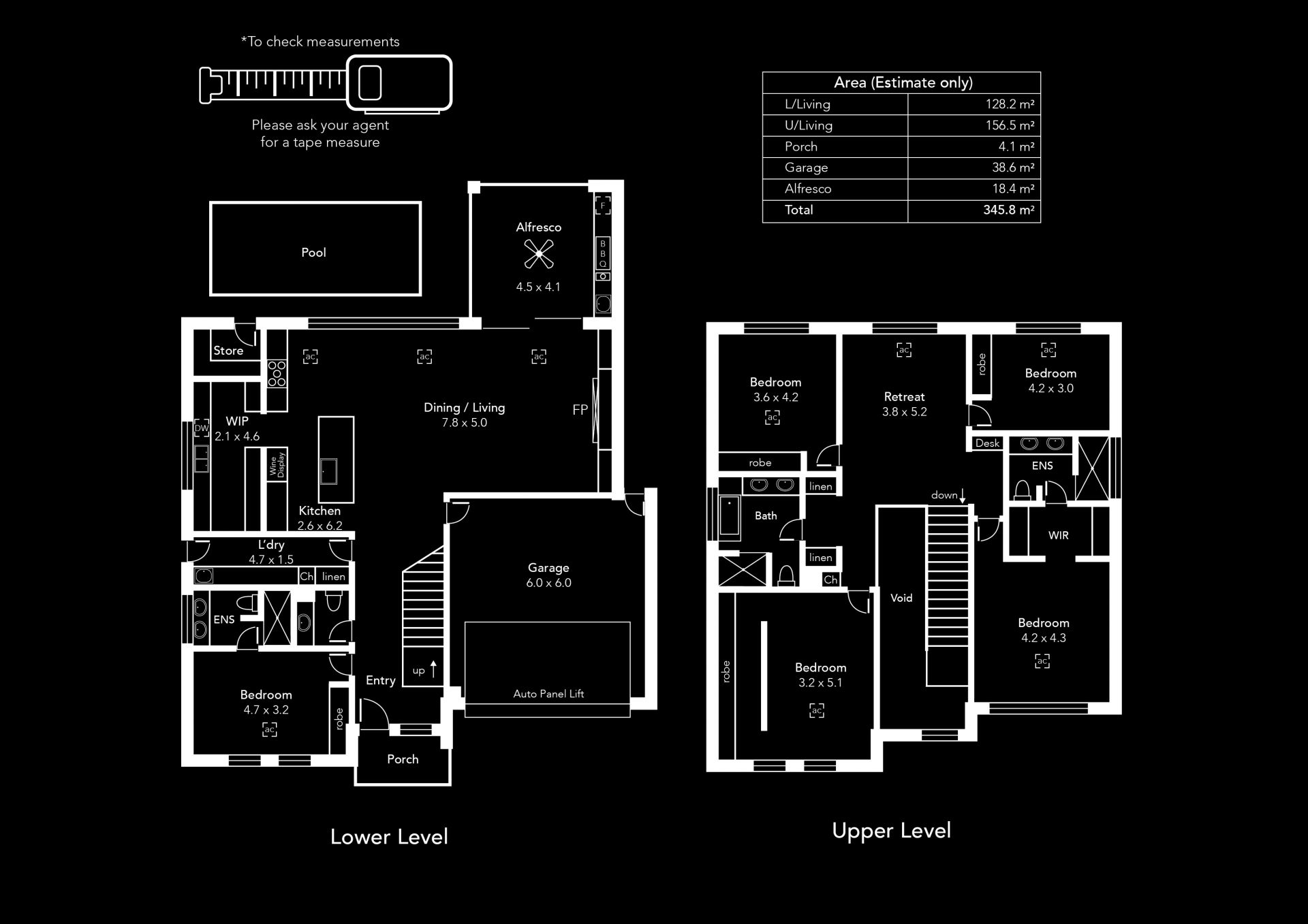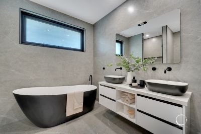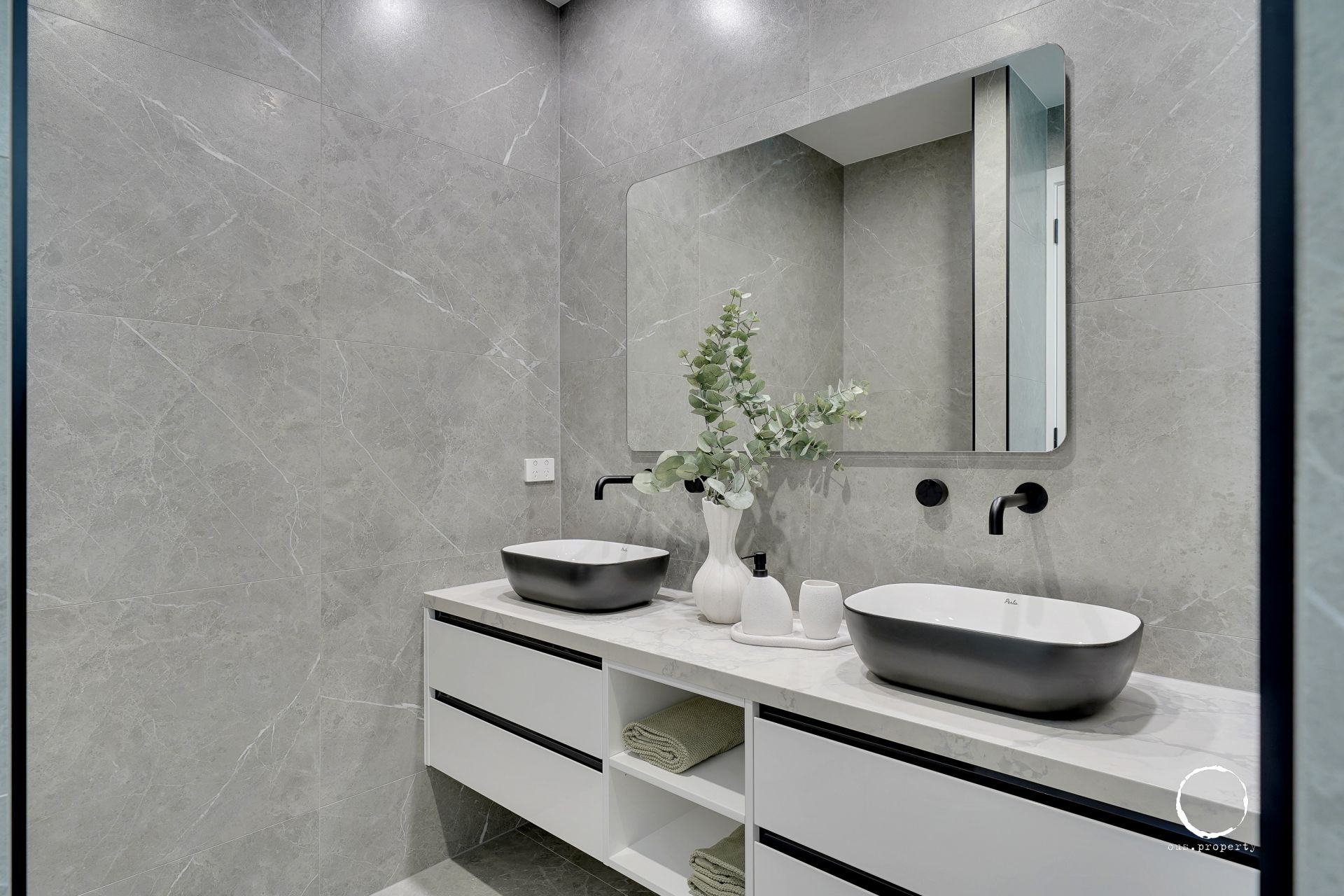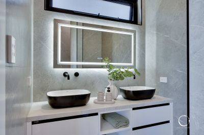 • Two fully tiled ensuites: double wall-hung stone-top vanities, backlit mirrors,