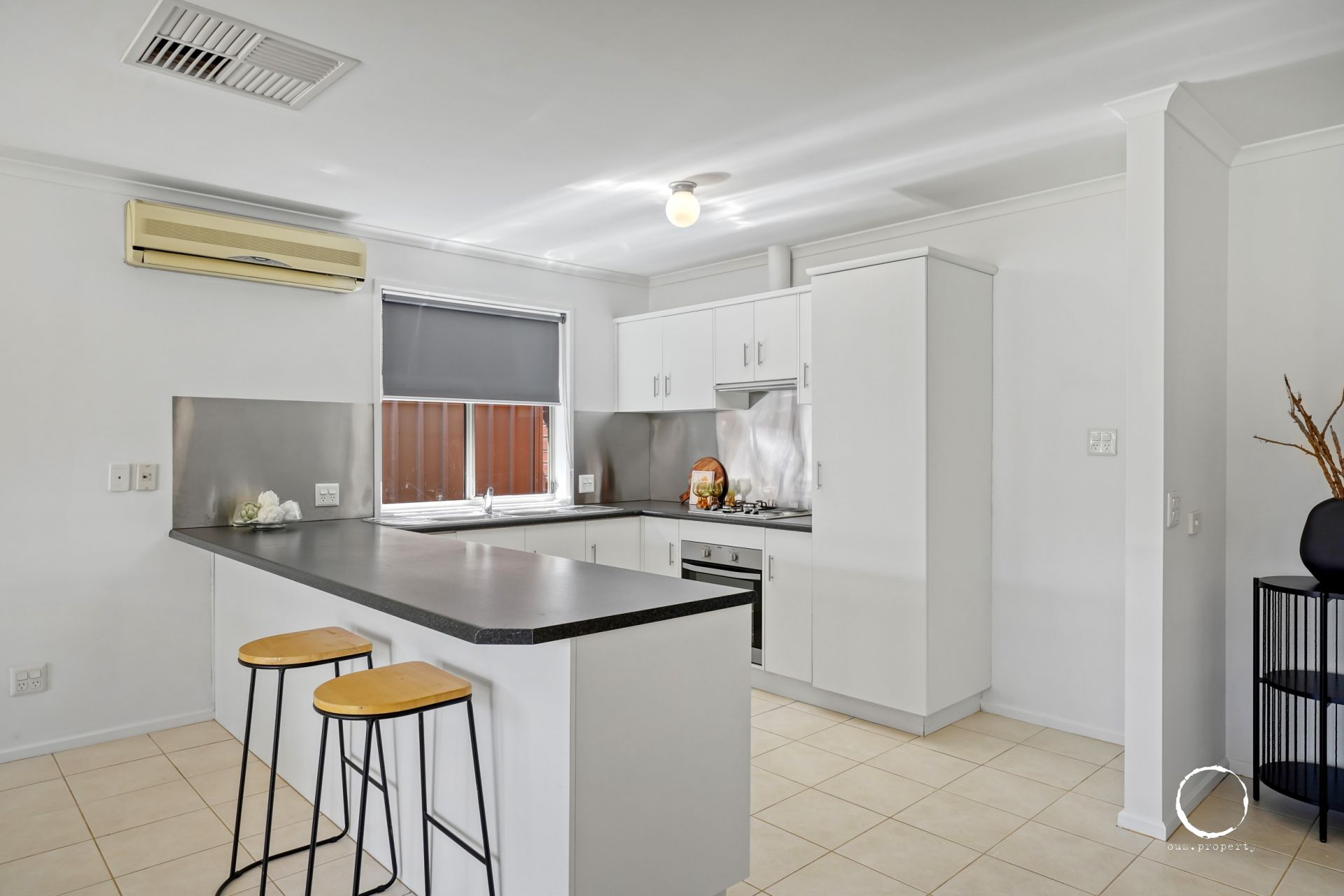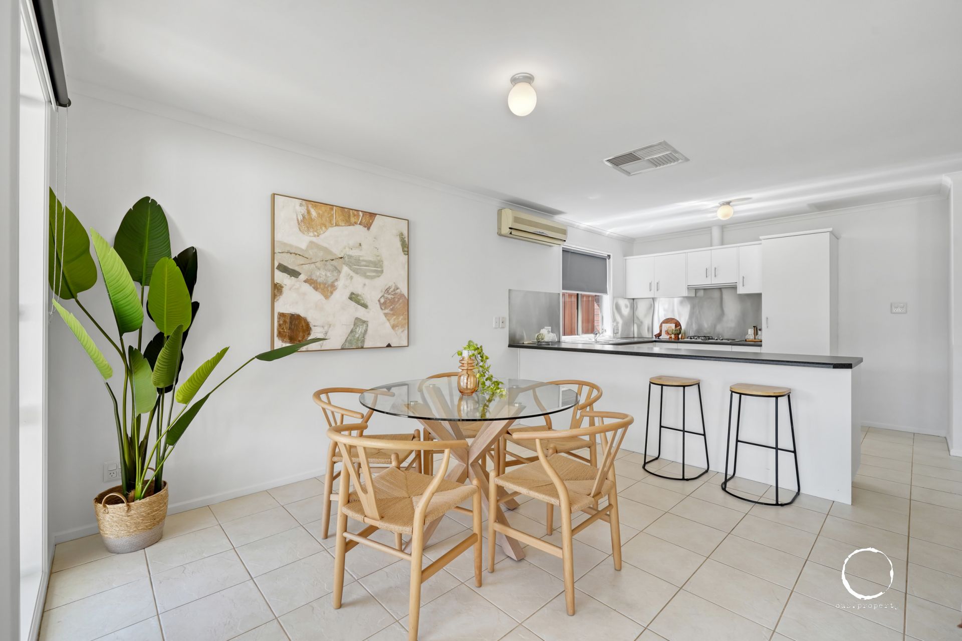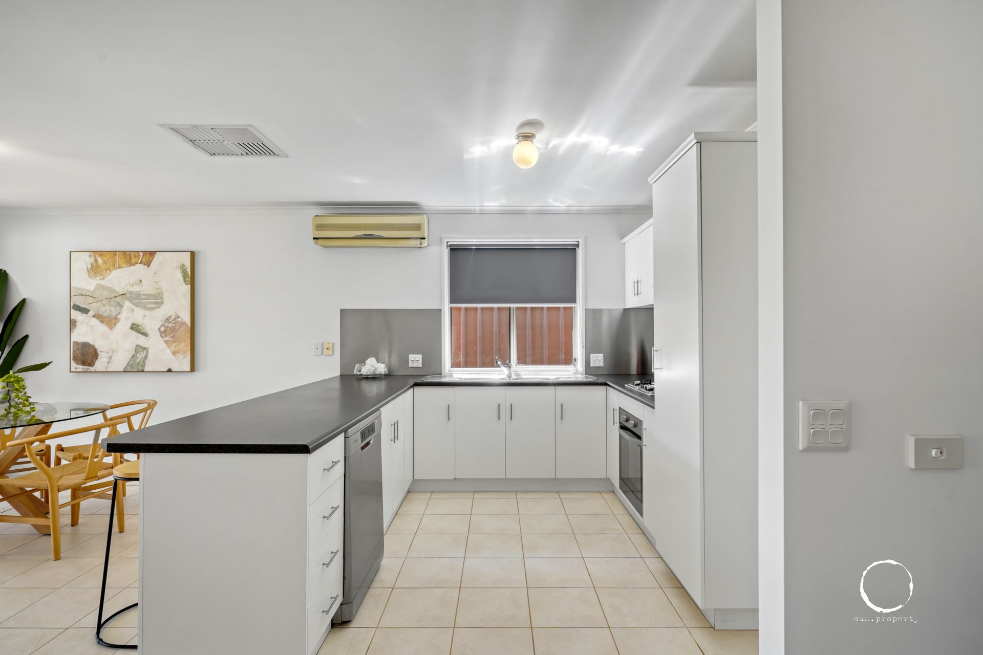 The kitchen is sleek and modern with stainless steel appliances, gas cooktop and a dishwasher, making meal prep a breeze. The open plan living and dining area is spacious and tiled, offering a bright, airy space for both relaxing and entertaining, which opens up to the private rear yard.