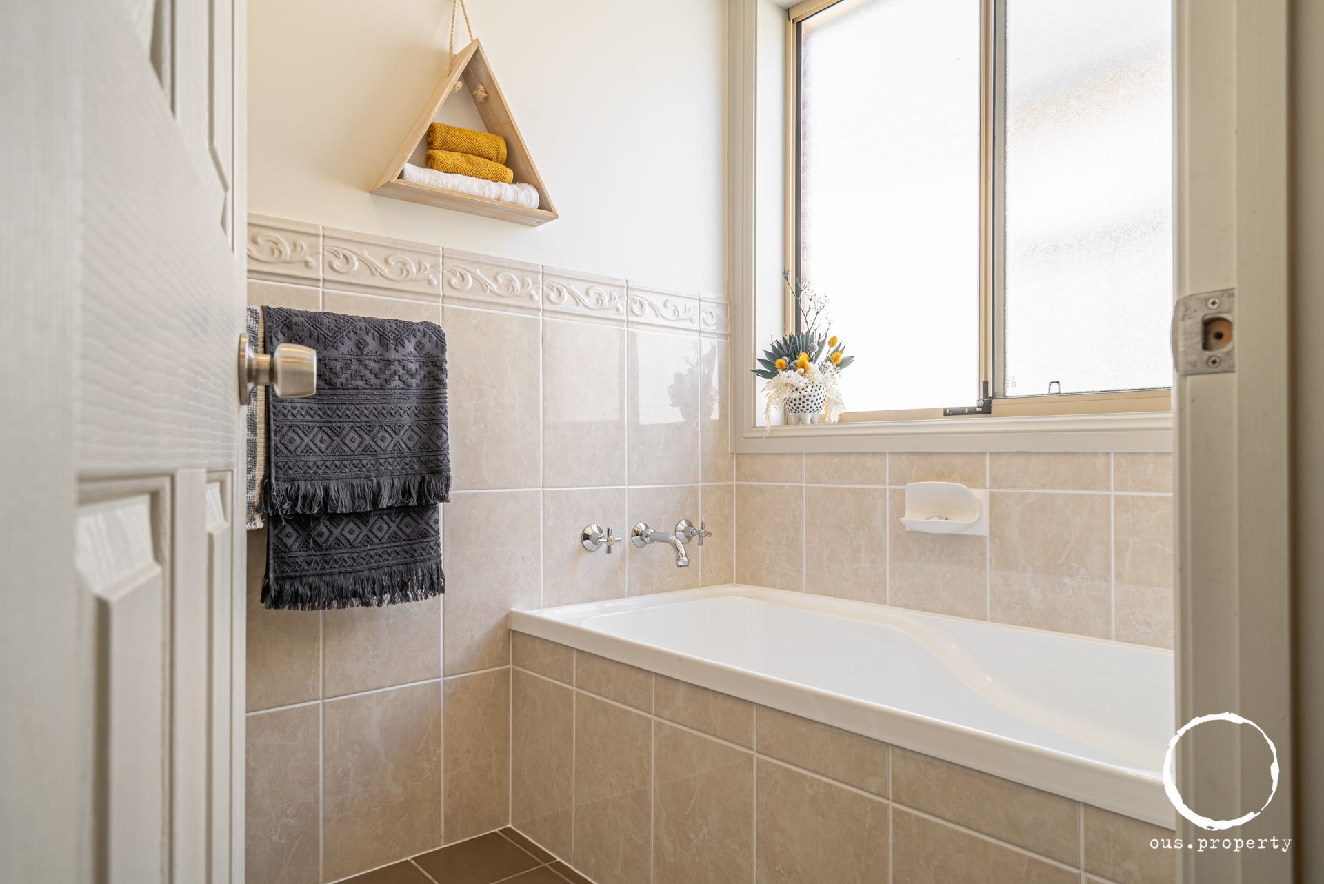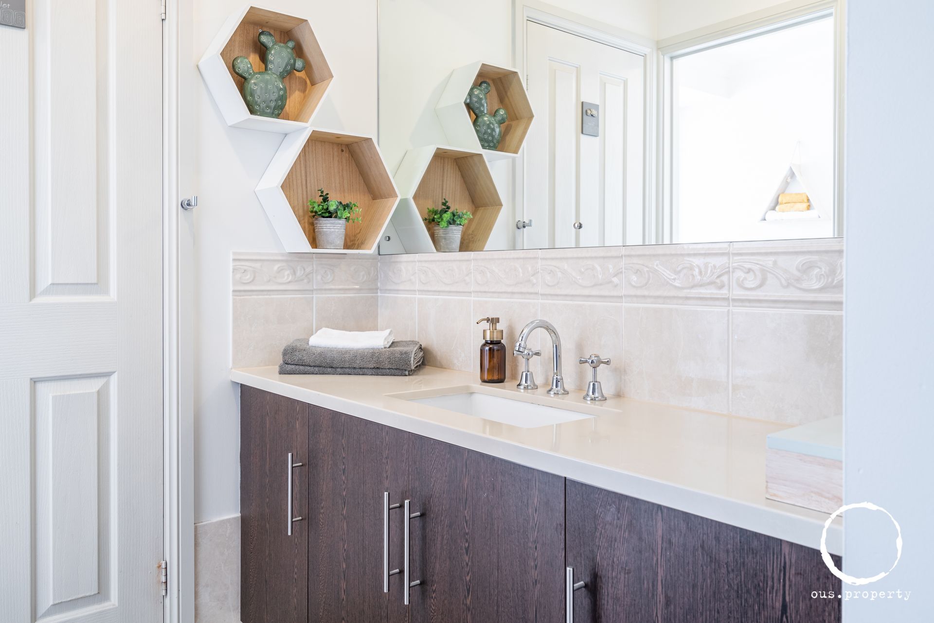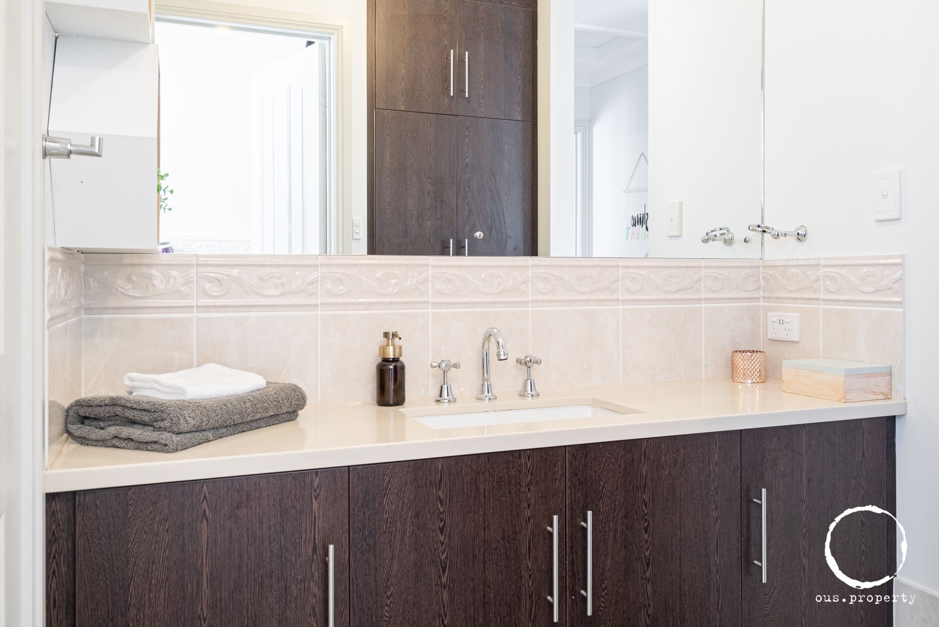 Easy-care flooring includes tiled living areas and woodgrain floating floors throughout the bedrooms and formal lounge. The vibe is warm and welcoming, showcasing a rich woodgrain finish to the kitchen and bathroom cabinetry offsetting neutral décor.