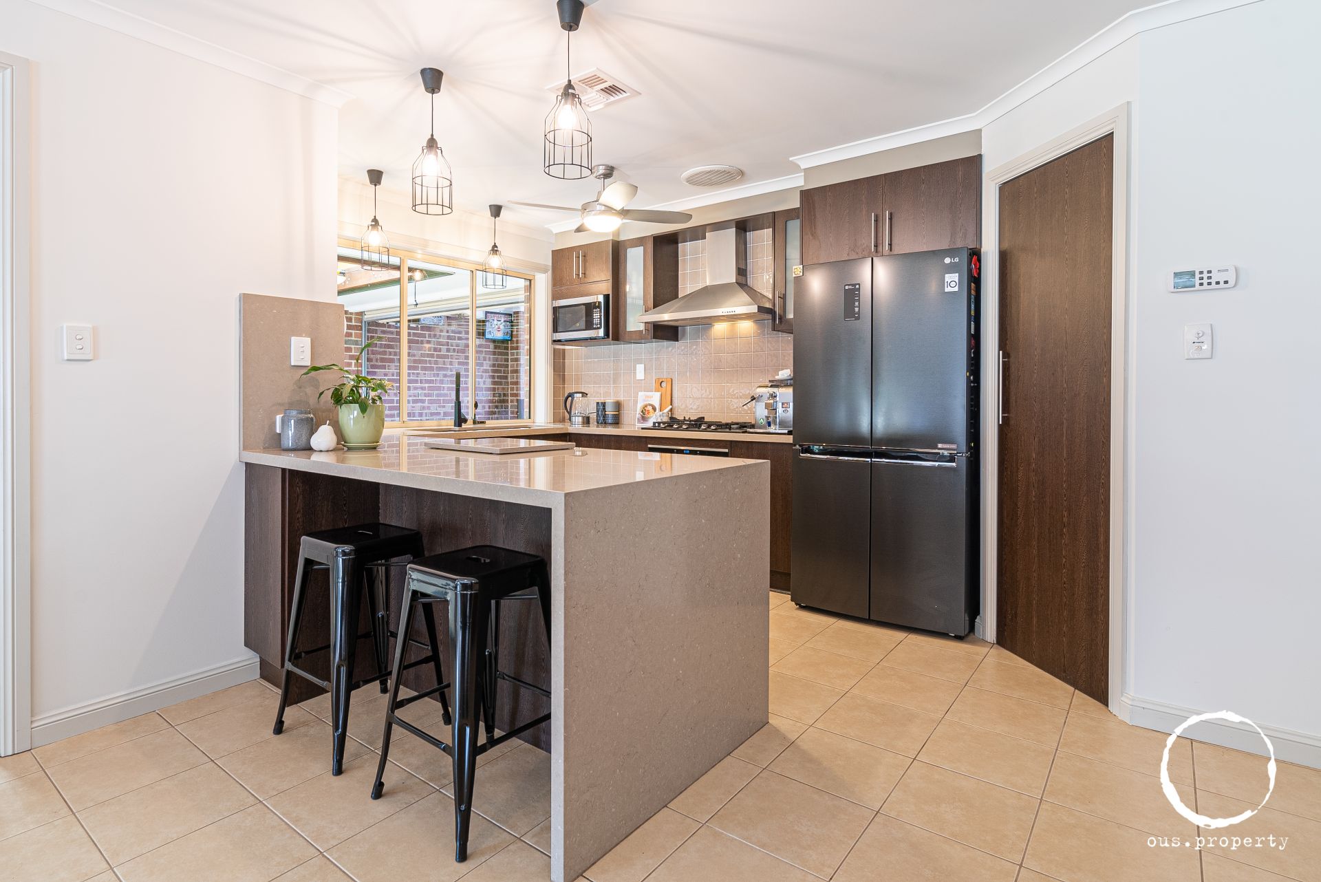 This sleek kitchen is designed to comfortably cater for families. It features a fantastic walk-in pantry, double sinks, a five-burner gas cooktop, rangehood and waterfall drop stone benchtop / breakfast bar, making family meal prep a breeze.