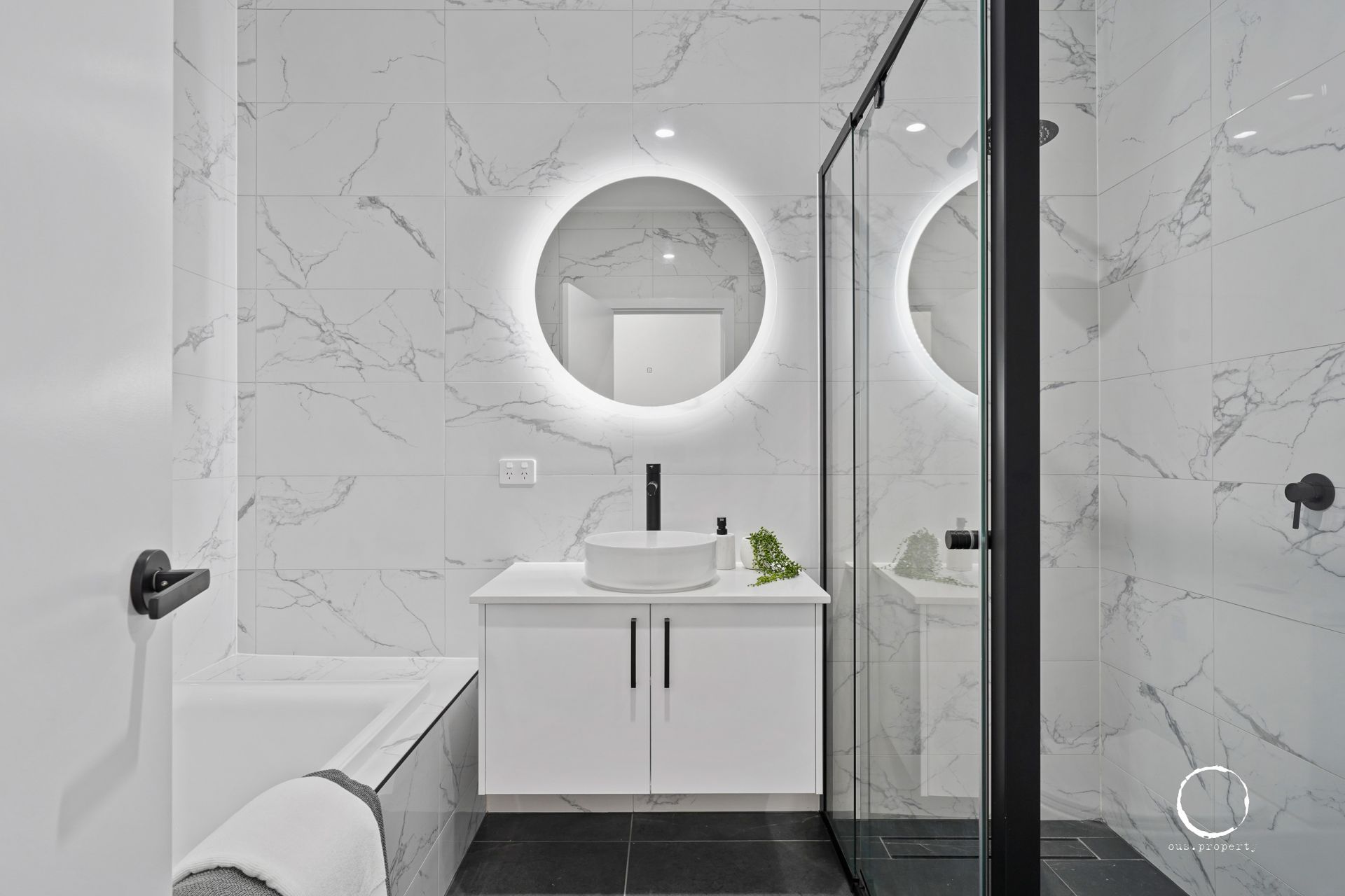 - Main bathroom includes a bathtub, large shower, wall-hung vanity and backlit mirror