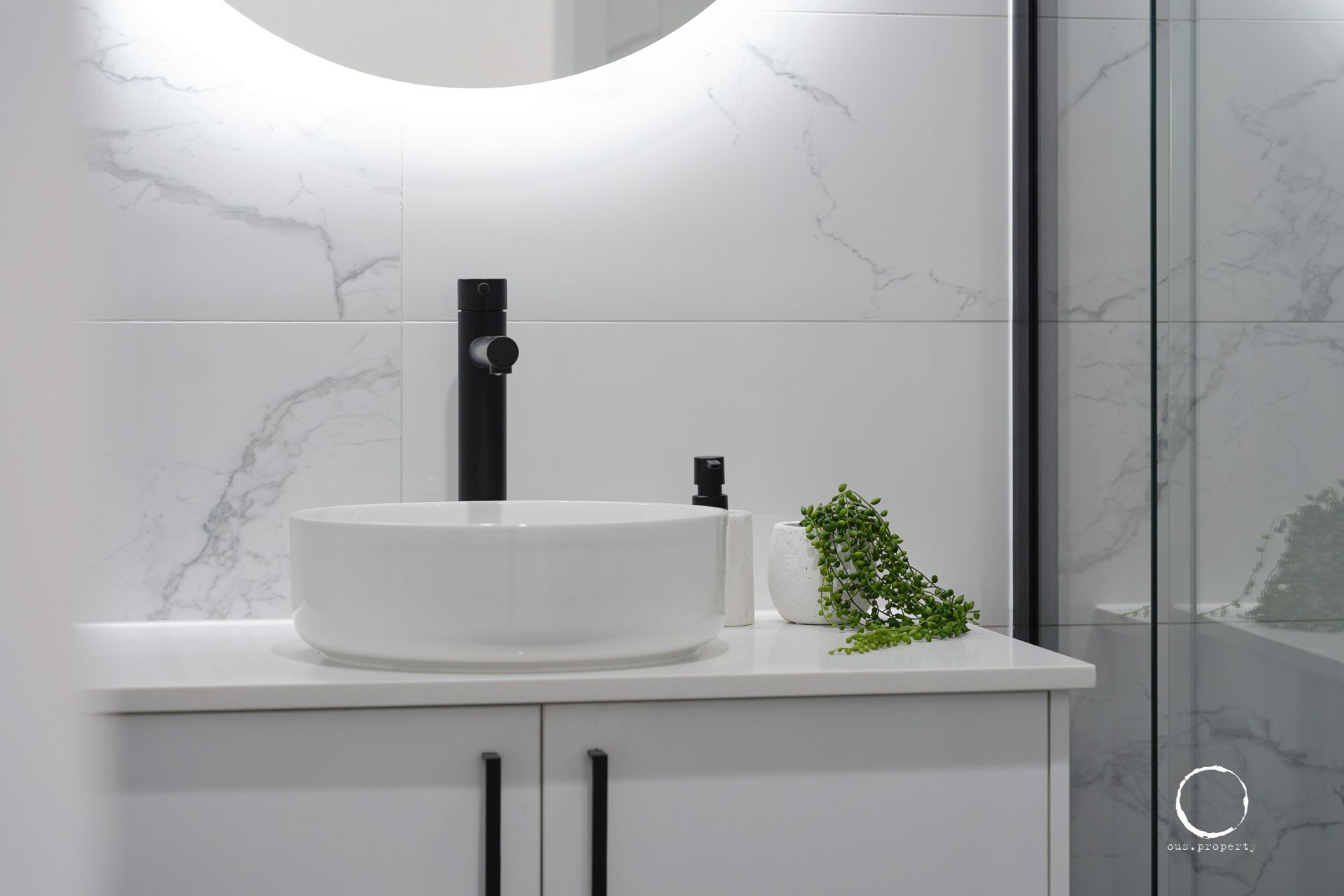 - Fully-tiled ensuite features a spacious shower, wall-hung vanity and vessel sink