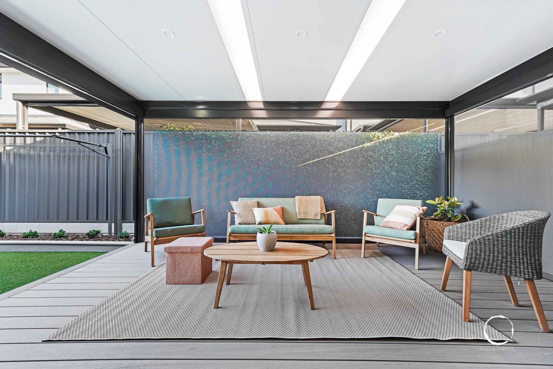 - Low maintenance yards with deck and pergola with fully enclosed blinds